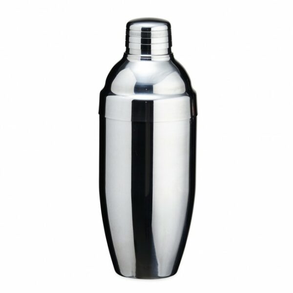 Coqueteleira de inox com capacidade para 750ml, contém tampa de pressão com peneira e tampa protetora.